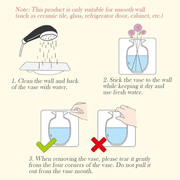 Reusable: Don't need to glue or nail. Remove and stick the Flower Vase again and again with no damage on the surfaces such as widows, glass door, mirror, refrigerator, glass cabinet, ceramic tile, etc.