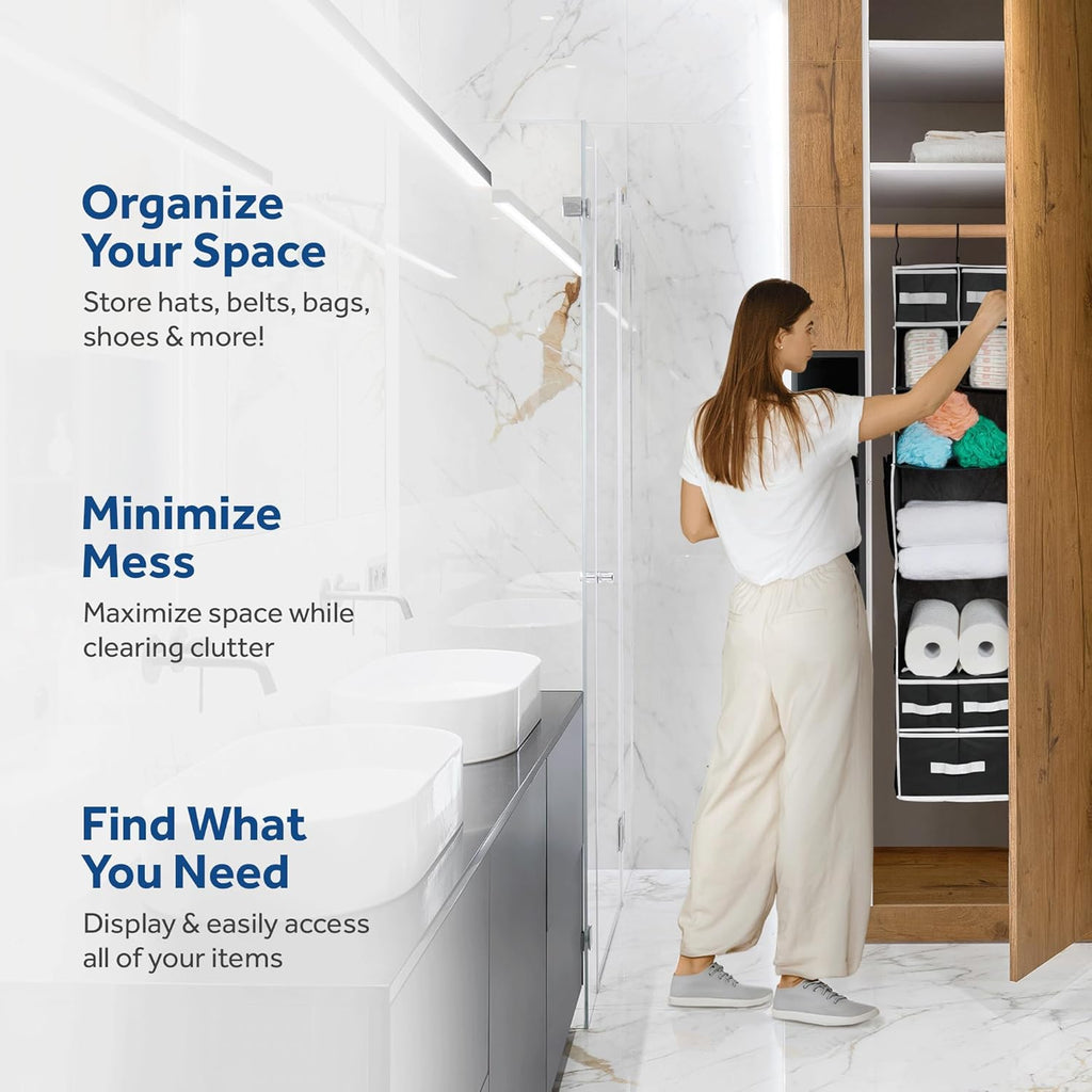• EASILY ACCESSIBLE - 2 Hangers are attached to the top of the organizer, so it doesn’t swivel. The entire front of the organizer is open, exposing the contents for easy access. Bins slide smoothly in and out with the sturdy handgrips and can be removed and carried from room to room.